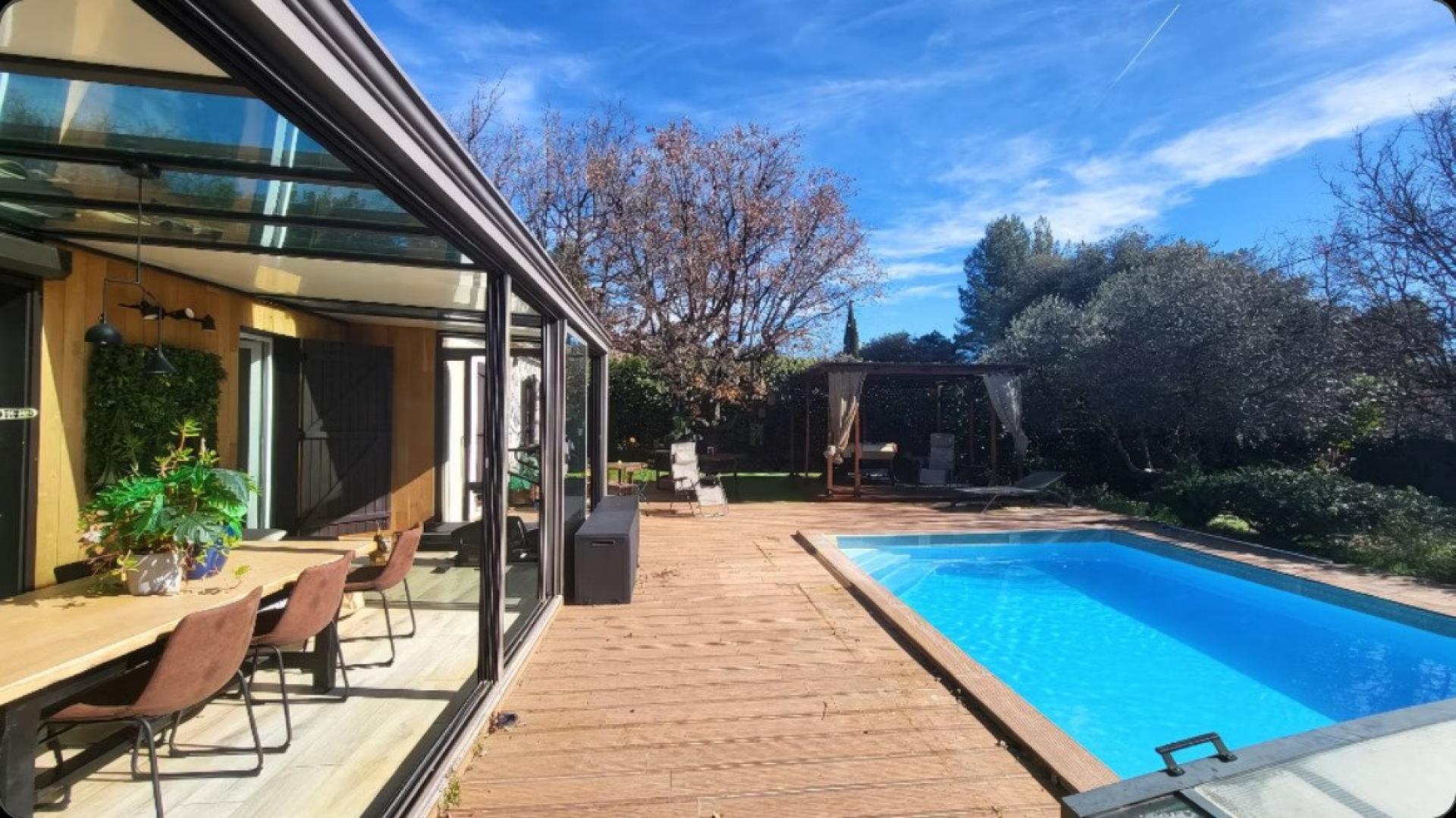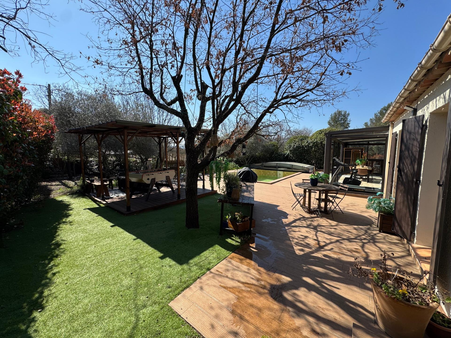 Située dans la commune de Seillons-Source-d'Argens (83470), cette propriété bénéficie d'un environnement paisible en pleine campagne de la Provence verte sur un terrain de 1500 m² clos et arboré. Avec une exposition sud offrant une luminosité optimale, un accès rapide aux commodités (écoles) et aux commerces de proximités (boulangerie et pharmacie), cette spacieuse maison familiale de 166 m² répartie en une habitation de types 4 d'environ 125 m² et un appartement T3 de 40 m² dont l'ensemble dispose de 5 chambres, d'un bureau, 3 toilettes, 4 salles de bains et de deux cuisines offrant un confort optimal. La maison climatisée et construite en 2000 dispose de menuiseries en double vitrage et d'un espace de vie de 42 m² ouvert sur une cuisine ouverte, entièrement équipée et aménagé. Bénéficiez d'un excellent DPE C (énergie) / A (climat) grâce à la climatisation réversible, au double vitrage, aux panneaux solaires (générant environ 1 600 €/an) et à un insert cheminée. De plus, l'extérieur n'est pas en reste avec une piscine 7x4 m et son abri roulant, 4 terrasses pour la détente, 4 pergolas, un chalet bois de 10 m² et un portail automatique ainsi qu'une véranda de 24 m² ajoute un attrait certain à ce bien. Potentiel locatif saisonnier ou possibilité double habitation. A visiter !!