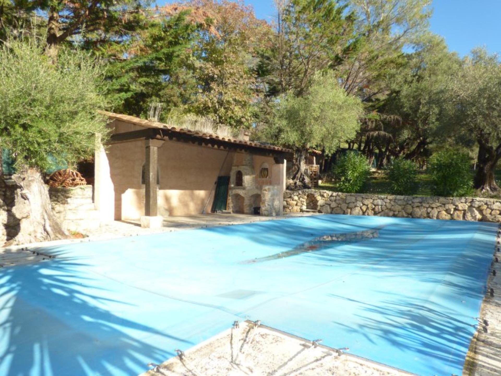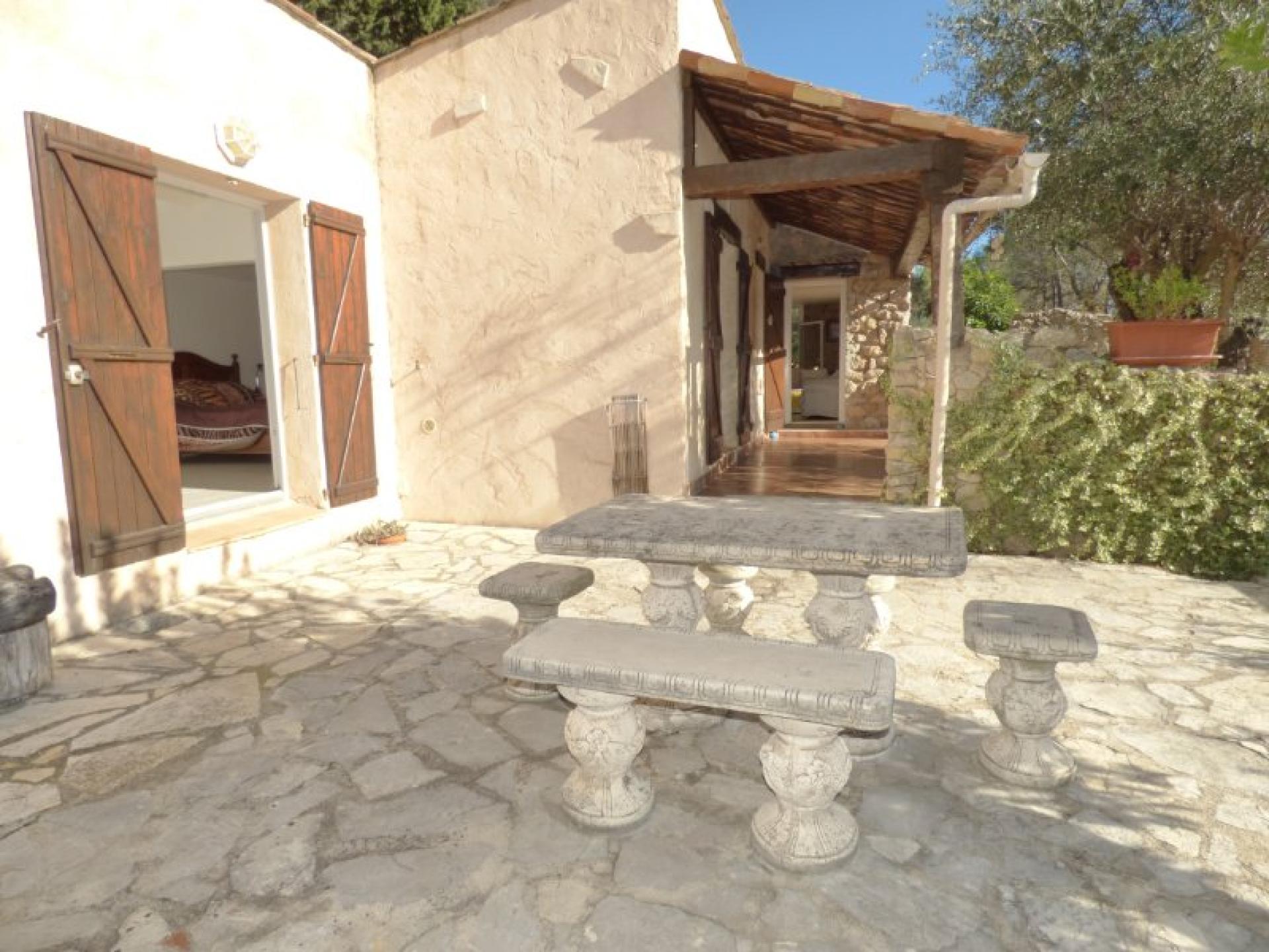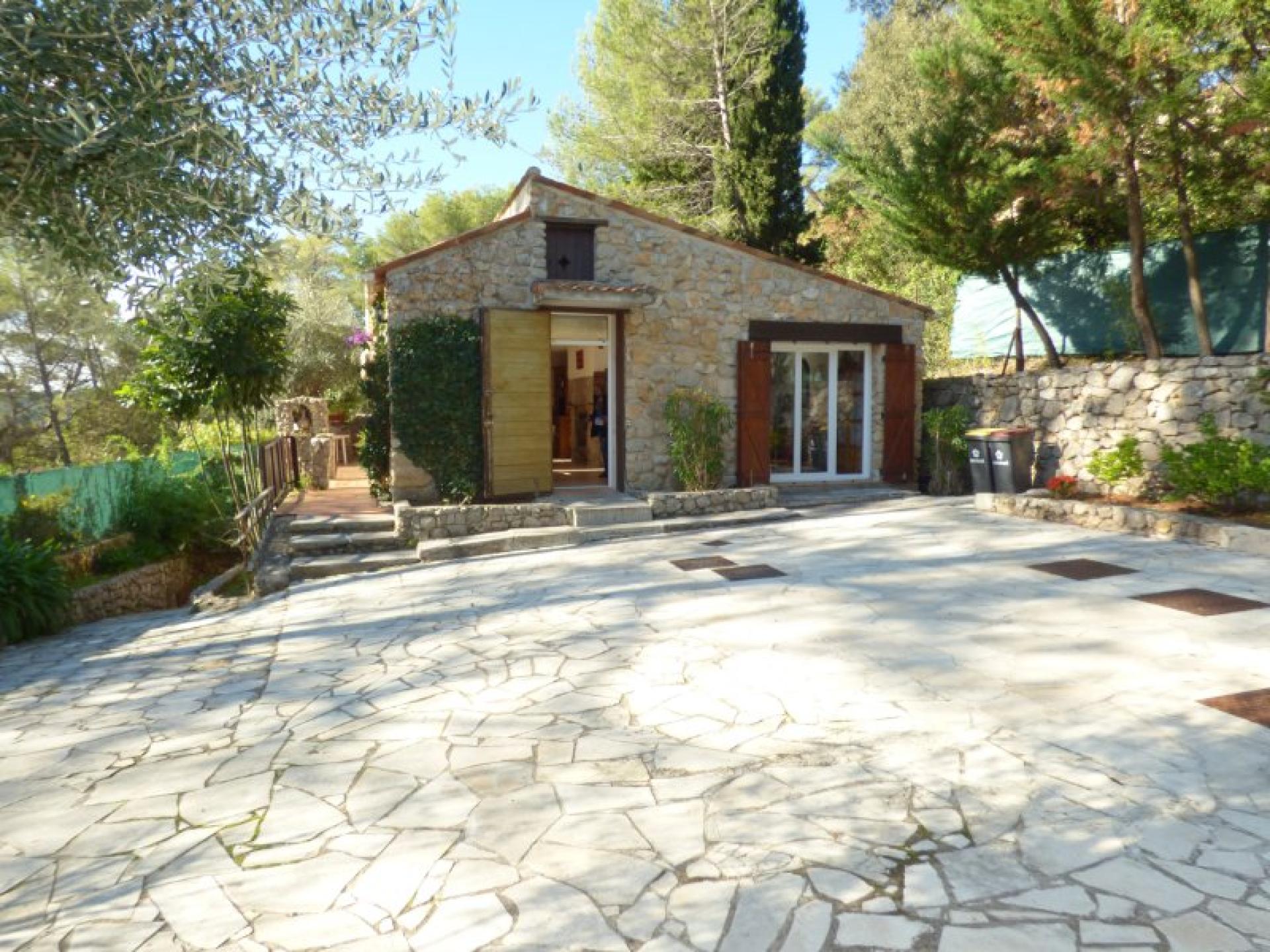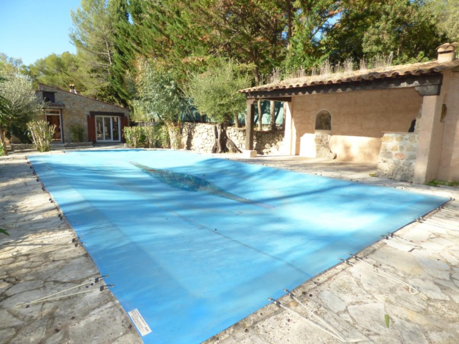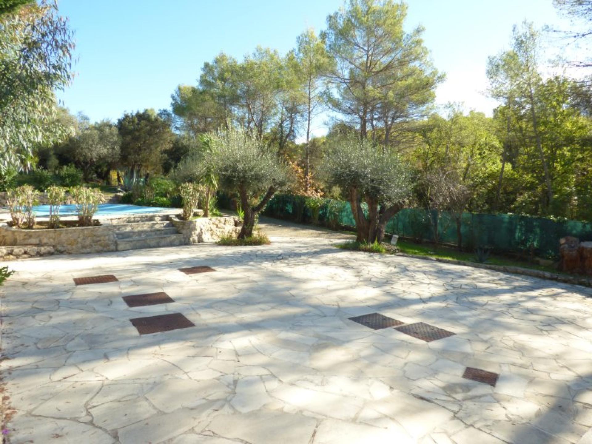 Exposée plein Sud et sans vis-à-vis, villa individuelle 4P d'environ 103 m² de plain-pied sur un terrain quasiment plat d'environ 2340 m² complanté d'oliviers centenaires et d'essences méditerranéennes et avec une piscine 8 m x 4 et son pool-house. Beau séjour avec cheminée et cuisine ouverte d'environ 56 m², 2 chambres avec placard et salle d'eau privative et un wc indépendant. Studio indépendant d'environ 18 m² avec kitchenette, salle d'eau et wc indépendant. Abri voitures et belle cave d'environ 20 m²
