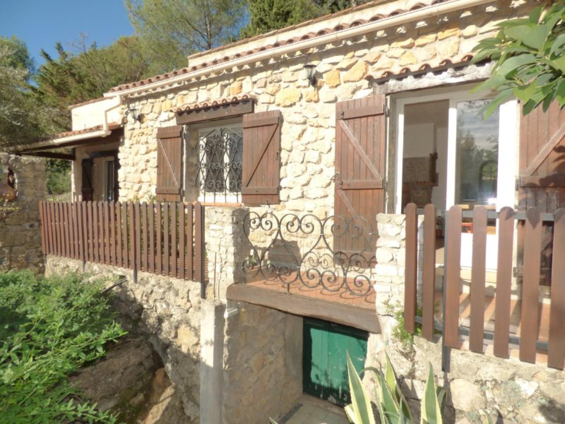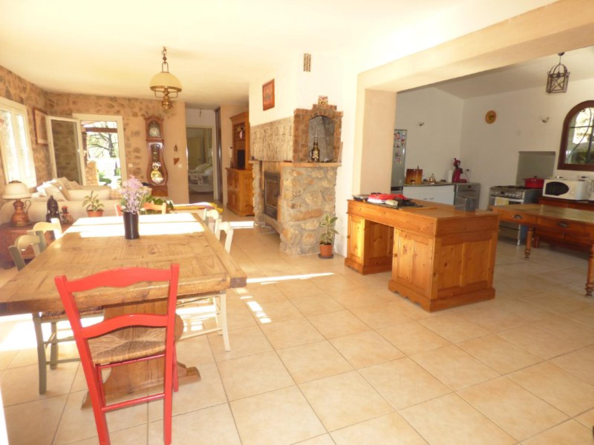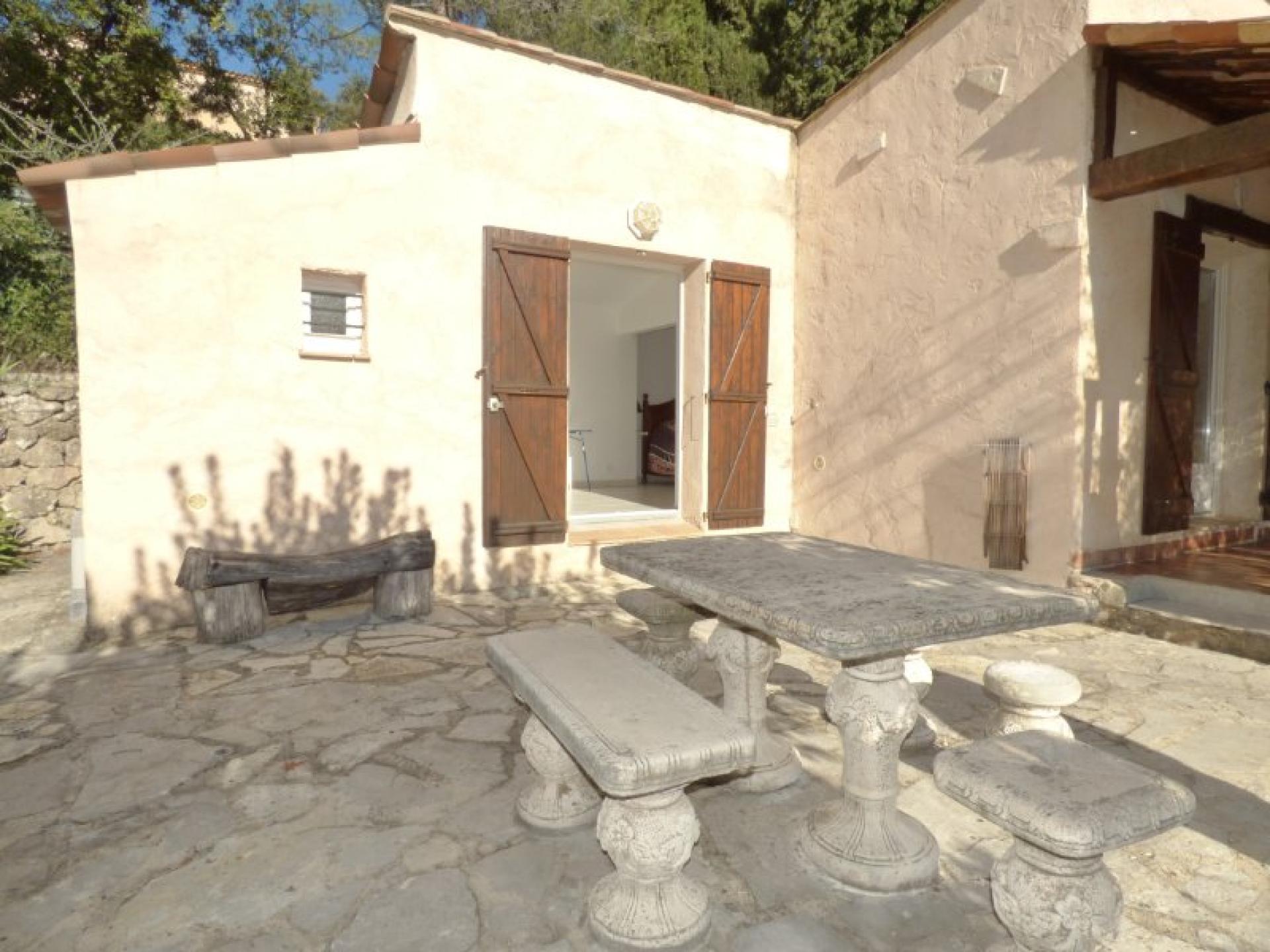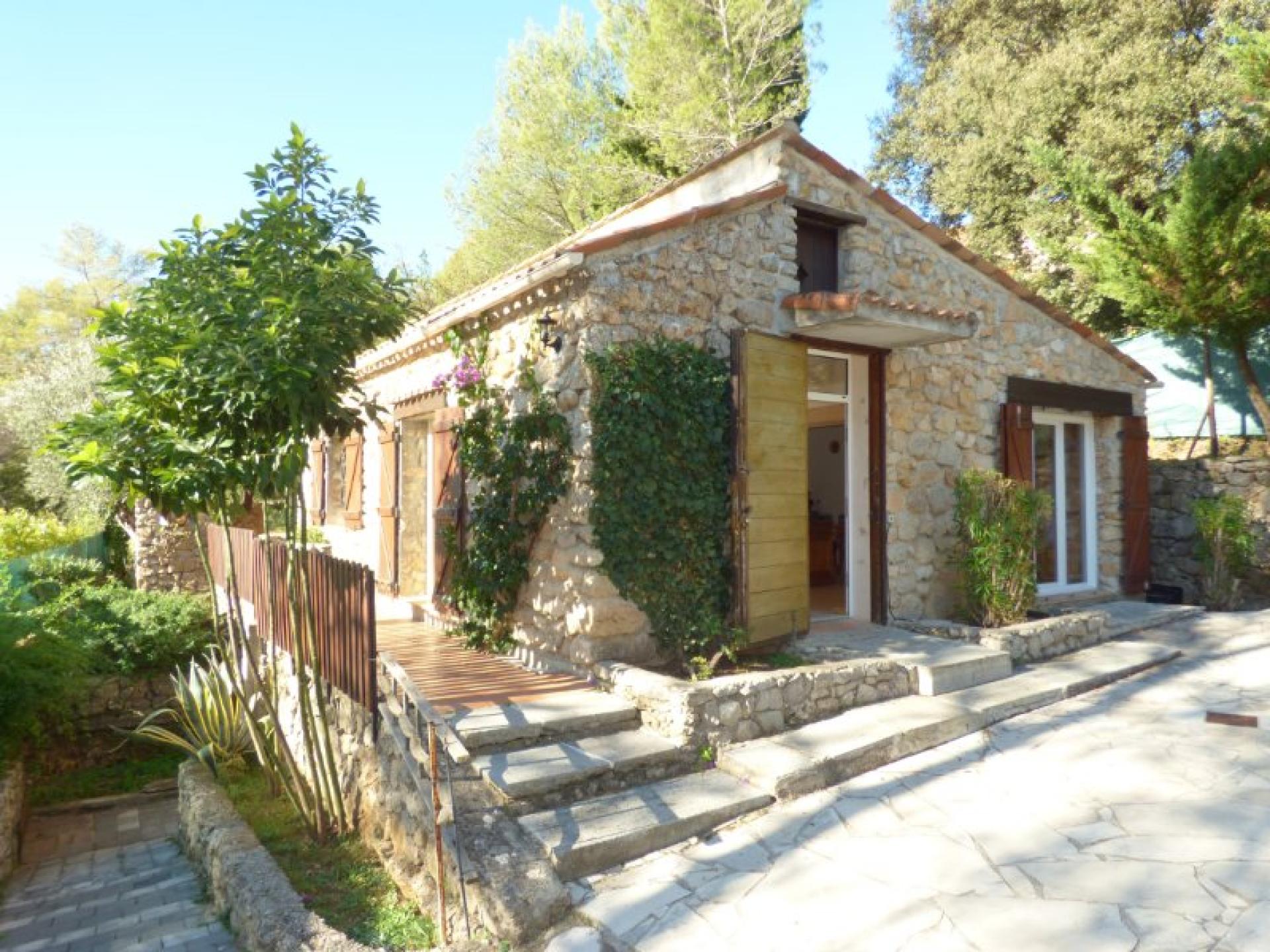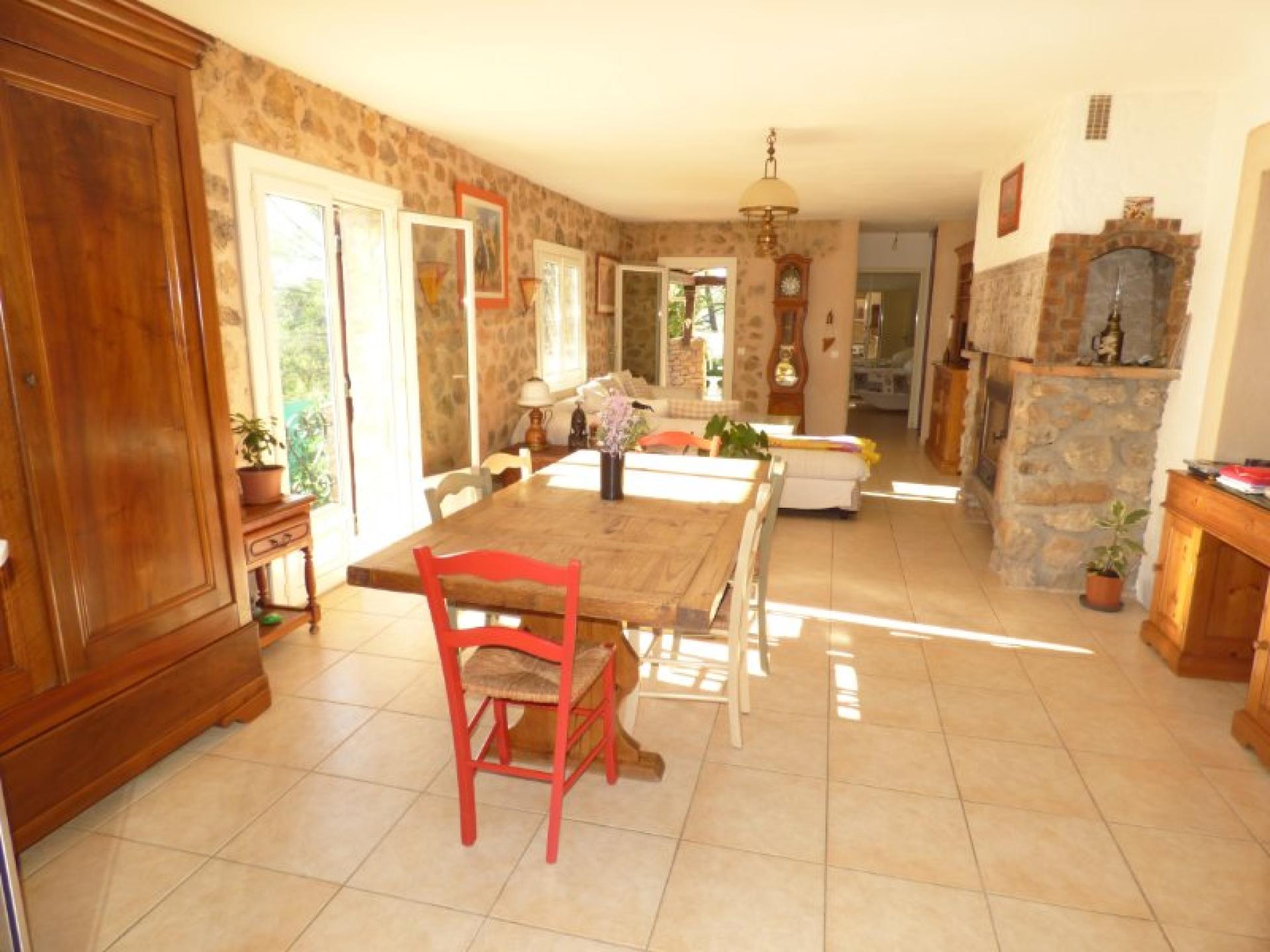 Exposée plein Sud et sans vis-à-vis, villa individuelle 4P d'environ 103 m² de plain-pied sur un terrain quasiment plat d'environ 2340 m² complanté d'oliviers centenaires et d'essences méditerranéennes et avec une piscine 8 m x 4 et son pool-house. Beau séjour avec cheminée et cuisine ouverte d'environ 56 m², 2 chambres avec placard et salle d'eau privative et un wc indépendant. Studio indépendant d'environ 18 m² avec kitchenette, salle d'eau et wc indépendant. Abri voitures et belle cave d'environ 20 m²