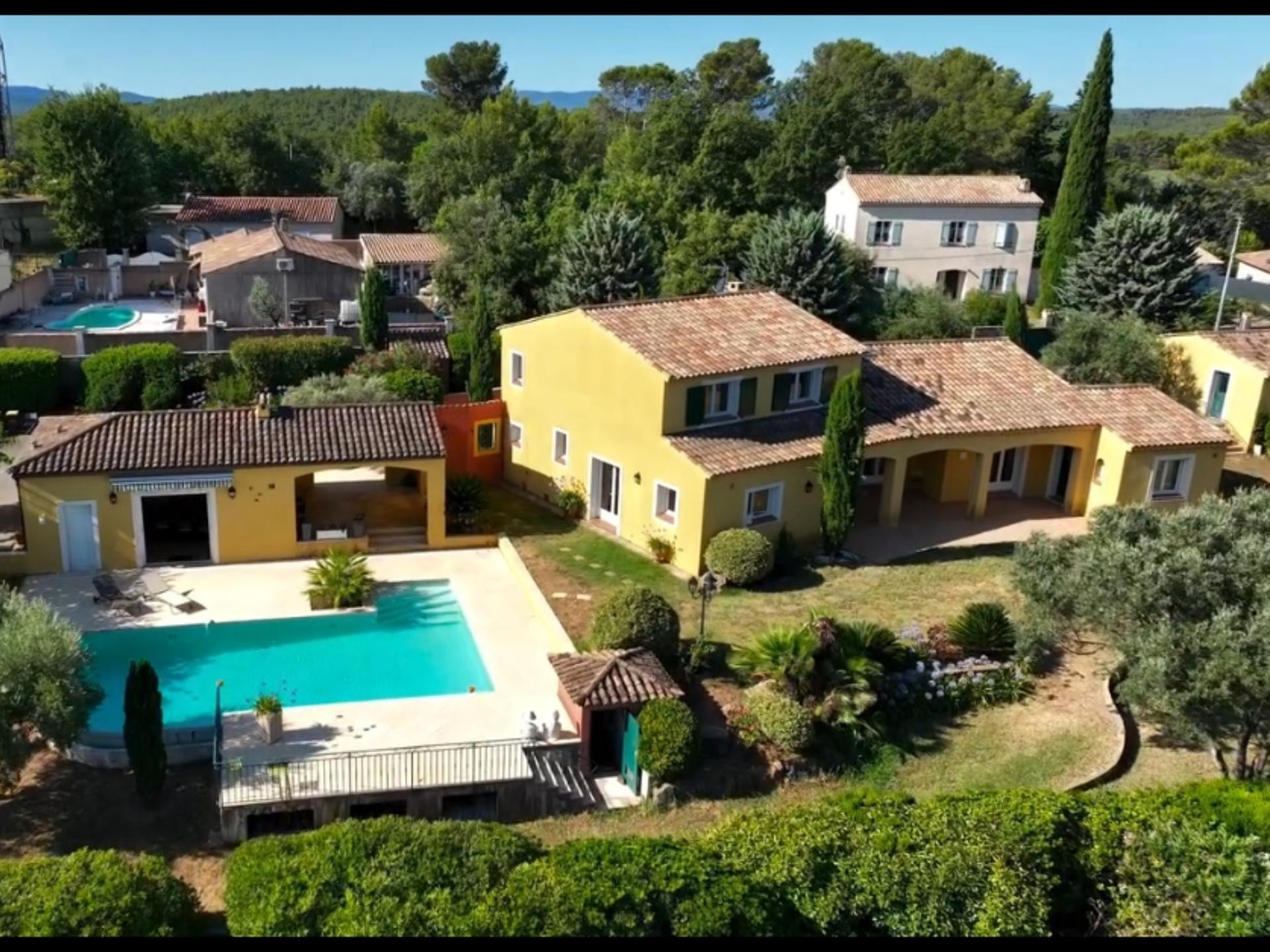 Située à Trans-en-Provence, dans le Var, dans le quartier résidentiel très recherché du Peical, cette magnifique propriété vous offre un cadre de vie luxueux alliant confort et sécurité. Bénéficiant d’un accès rapide aux principaux axes routiers, à la gare TGV des Arcs sur Argens et à proximité des plages de la Côte d’Azur,cette grande bastide provençale construite en 1985 a fait l’objet d’un agrandissement et d’une rénovation complète en 2004. La bastide propose 264 m2 habitables, sur 2300 m2 de terrain entièrement végétalisés et paysagés, idéale en résidence principale ou secondaire et offre une multitude de prestations, des finitions parfaites et un aménagement fonctionnel pour toute la famille. La maison principale se compose d'un hall d’entrée, une triple pièce de vie spacieuse avec cheminée insert, climatisation réversible, une cuisine moderne Mobalpa entièrement équipée.Vous profiterez de la suite parentale composée de trois espaces : un immense dressing, une chambre donnant sur la terrasse, une salle de bain avec baignoire, douche et WC, communiquant à une buanderie. À l’étage, vous découvrirez un large palier espace bureau, deux chambres dont une avec dressing, une salle de bain avec baignoire et WC séparé . Les enfants auront accès à une immense pièce de jeux qui les attends dans les combles. Une dépendance T2 composé d'un salon, une kitchenette entièrement aménagée, une chambre, une salle d'eau et WC vous permettra d'accueillir vos amis. Il est à noter aussi : • 32 panneaux photovoltaïques (12 kWh), production d'énergie pour une autonomie totale + borne de charge rapide pour voiture électrique, un grand garage sur sous-sol total. La propriété est équipée de la climatisation et d’un système de domotique centralisée. Vous profiterez d'une grande piscine à débordement en mosaïque avec son Pool house spacieux, grande pièce de vie lumineuse avec cheminée, cuisine provençale Mobalpa entièrement aménagée et équipée. Envie d'en savoir plus ? Un dossier complet ainsi qu'une vidéo par drone sont disponibles sur demande. Les visites sont possibles 7 jours sur 7. Contactez Laurence par téléphone ou whatsapp : 06 31 98 57 48 pour organiser votre visite privée.