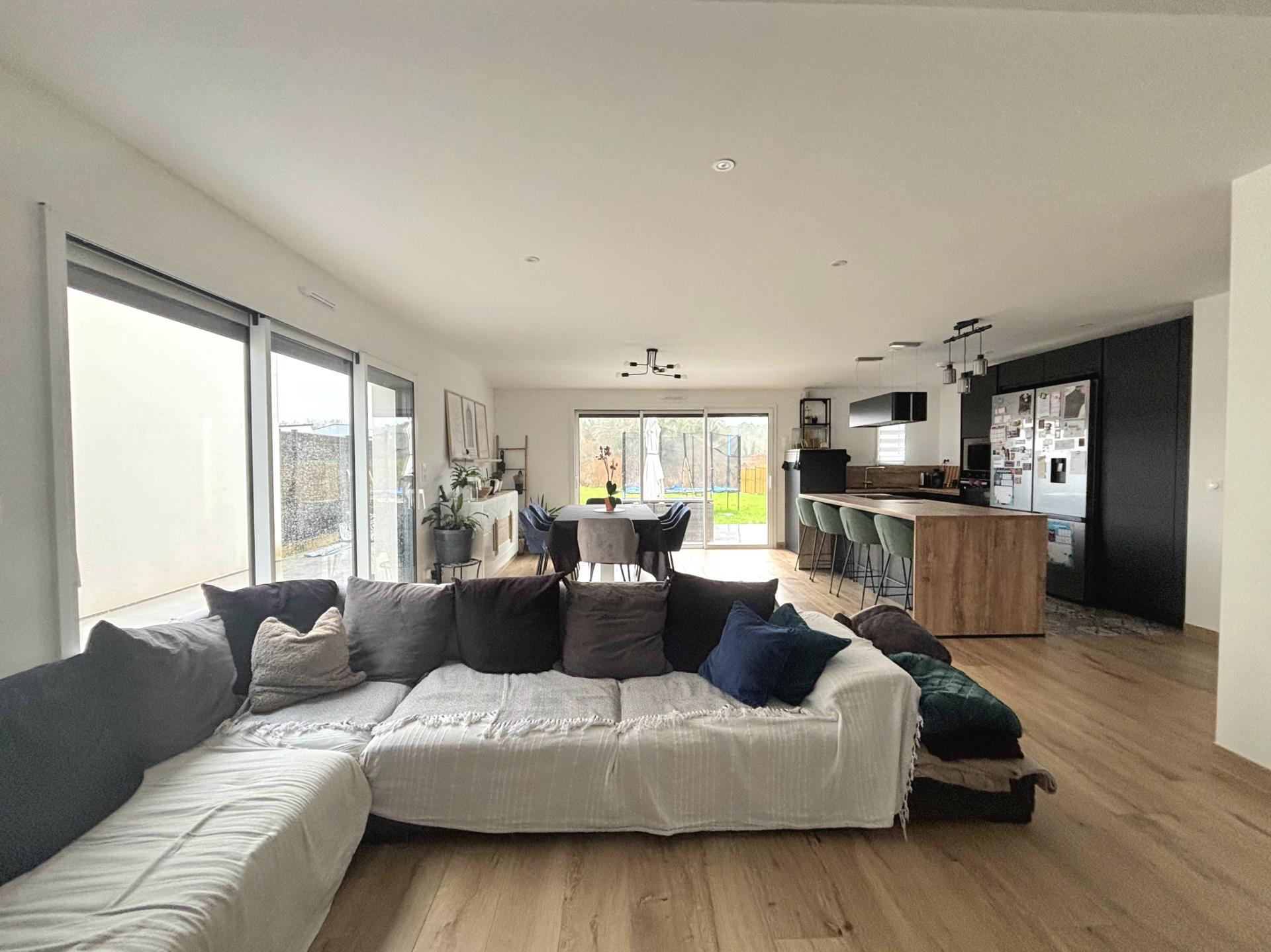Bien rare sur le secteur ! La Nature s'est invitée au coeur du lotissement verdoyant et aéré de Vannes Village, au dessus de la clinique Océane, pour vous présenter une belle contemporaine de 2023 de 171 m². Elle est édifiée sur un terrain de 935 m², avec une vue unique et dégagée. Dès le seuil franchi sous un porche, des sanitaires avec lave-mains ainsi que de grands dressing vous accueillent. Longez le corridor qui vous mène à un bel espace de vie de 55 m². Découvrez-y une élégante cuisine américaine aménagée et équipée d'un grand îlot central, doté d'un espace cuisson, vous permettant ainsi de profiter d'instants privilégiés avec vos convives. Attenant à la cuisine, un cellier/buanderie et sa porte de service donne accès à la terrasse, mais aussi au garage carrelé de 27 m². Le double séjour/salon bénéficie de la lumière naturelle grâce aux 2 belles baies, offrant à votre vue un joli tableau sur les extérieurs. Au rez-de-chaussée, la suite parentale vous séduira avec son large dressing et sa salle d'eau privative décorée avec goût et son accès à une terrasse intime. L'étage vous propose 4 jolies chambres, un palier pour un espace détente/bureau, des wc séparés et une grande salle de bain. Les beaux volumes optimisés de cette maison bien agencée, raviront une famille en quête de confort, notamment avec le chauffage au sol. De plus sérénité et tranquillité sont offertes avec les garanties décennales liées à cette maison . Ne passez pas à coté de l'opportunité d'une vie proche de tout : commerces, écoles, collège, lycée, principaux axes accessibles rapidement sans aucune nuisance, clinique...et bus à 400 m: la ligne 1 qui dessert toutes les 10 mn la gare et le port de Vannes. Cette vie urbaine néanmoins saine est permise grâce aux nombreux sentiers. Ne tardez pas pour une visite pleine de surprises !