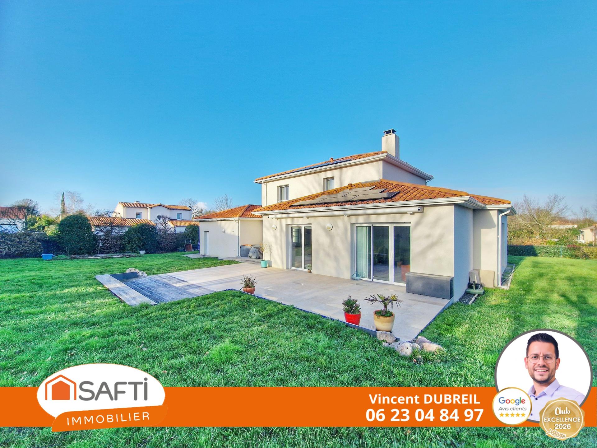 Venez découvrir cette maison familiale très lumineuse construite en 2004 et édifiée sur une parcelle de 1430m². Grande entrée avec une belle hauteur sous plafond donnant sur un escalier en marbre. Une grande pièce de vie de 50m² baignée de lumière de part sa triple exposition, avec sa cuisine ouverte de 17m² qui peut se fermer avec ses portes à galandage. Une grande arrière-cuisine/ buanderie. Un wc indépendant. Belle suite parentale avec sa salle de bain et douche sans oublier son dressing. À l'étage, vous profiterez d'un grand palier desservant trois chambres, chacune avec un grand placard, une salle d'eau et un wc indépendant. Vous bénéficierez également d'un garage de 44m² et d'une belle terrasse donnant sur un vaste jardin exposé Sud-Ouest. À proximité des transports scolaire, bus 97 et 47. Venez y déposer vos valises !