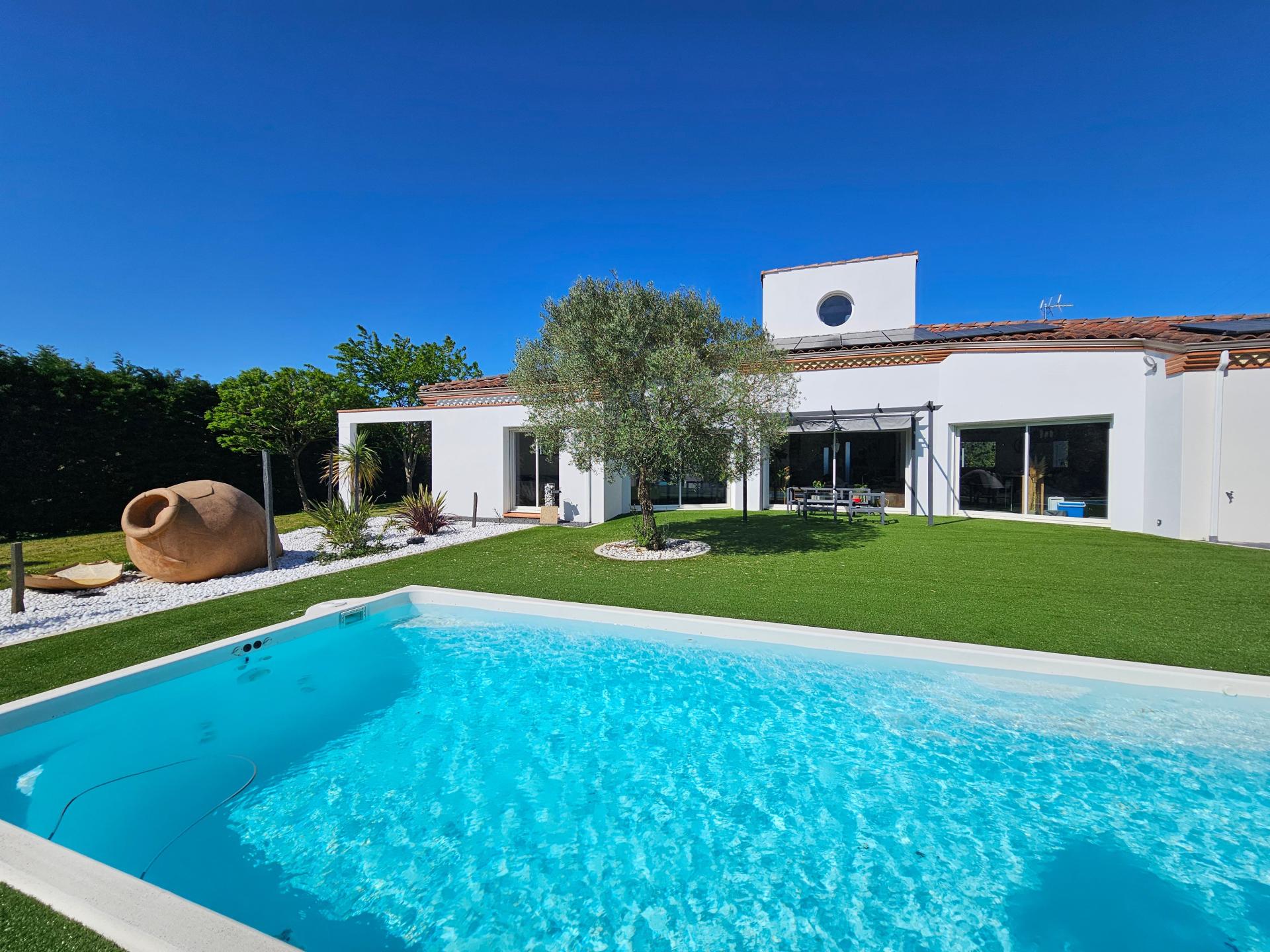 A seulement 7 minutes de Villefranche de Lauragais, son accès autoroutier et ses facilités, venez découvrir cette propriété au cadre paisible. Idéalement nichée sur un terrain de 2464 m², elle bénéficie d'une proximité appréciable avec les commodités du chef lieu du canton tout en préservant une tranquillité recherchée. À l'extérieur, cette maison de plain-pied avec Mezzanine se distingue par son garage volumineux, sa piscine rafraîchissante, son pool house de 17 m², qui offrent des espaces de vie extérieurs agréables pour se détendre ou recevoir des invités. De plus, la propriété dispose de plusieurs places de parking, assurant facilité et confort pour les résidents et les visiteurs. À l'intérieur, cette demeure de 170 m² propose un aménagement accueillant avec sa somptueuse cuisine équipée ouvrant sur le séjour et le coin piscine et ses 4 spacieuses chambres. Les 2 toilettes et les 2 salles de bain offrent praticité et confort au quotidien. Équipée de deux climatisations réversibles gainables, de volets roulants électriques, de panneaux photovoltaïques, cette maison allie modernité et fonctionnalité pour un cadre de vie harmonieux. A visiter sans tarder!